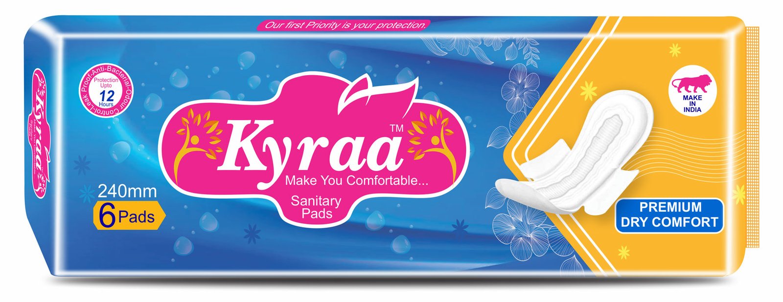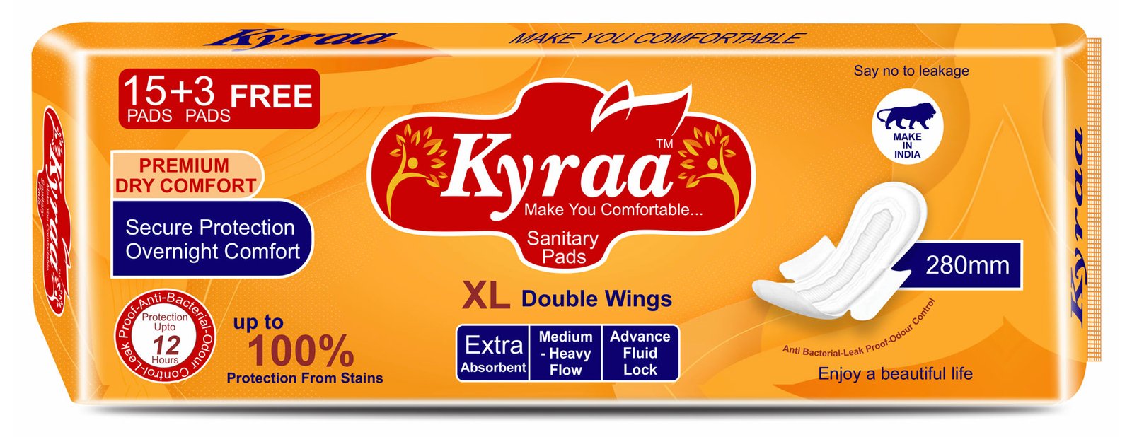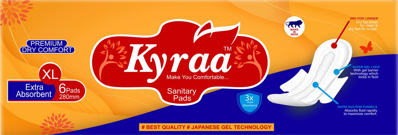 Kyraa brand's major goal is to provide hygienic, chemically free and naturally soft Sanitry pads to womens being to overcome the mental pressure of periods duration. Kyraa provides extra-large premium drycomfort sanitry pads to make life of womens happier. Available in both regular and extra large ranges: