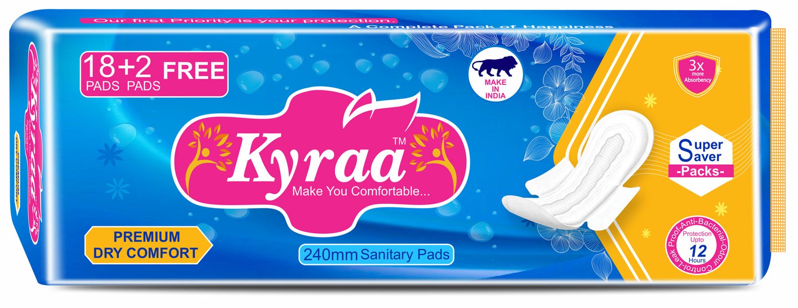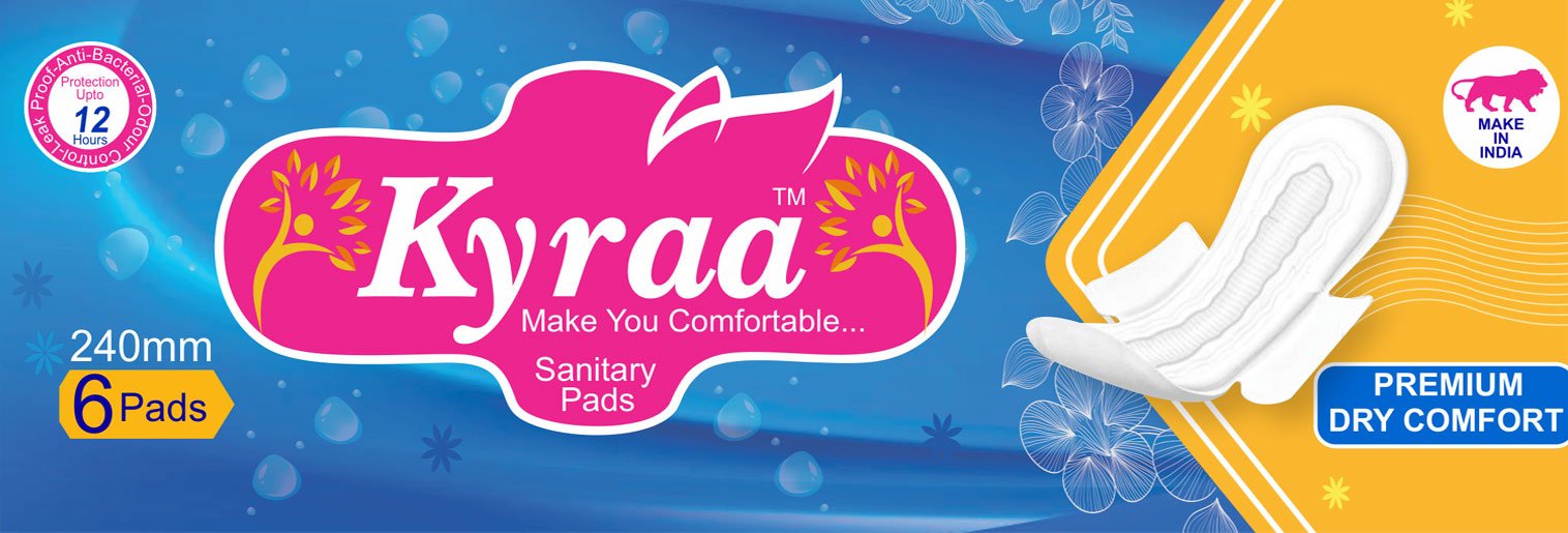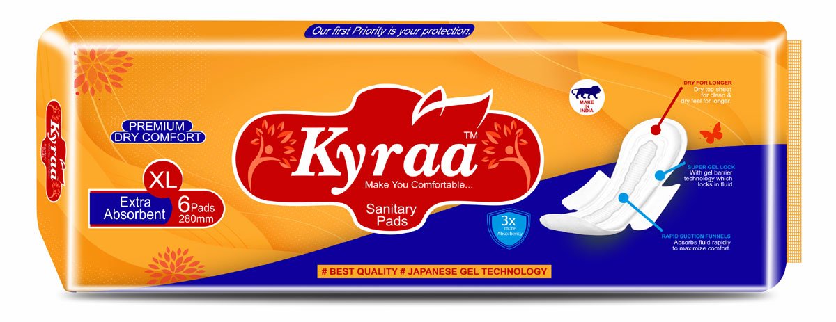 Kyraa brand's major goal is to provide hygienic, chemically free and naturally soft Sanitry pads to womens being to overcome the mental pressure of periods duration. Kyraa provides extra-large premium drycomfort sanitry pads to make life of womens happier. Available in both regular and extra large ranges: